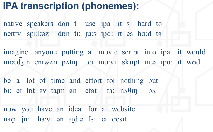 Das international phonetic alphabet wurde zuerst 1888 von der association phonétique internationale (international phonetic association) veröffentlicht. A system of symbols for showing the speech sounds of a… A series of signs and letters propagated by the association phonétique internationale for. The international phonetic alphabet is defined as an alphabet used across the world where each symbol represents the sounds of spoken language. It was devised by the . A system developed during the late 19th century to symbolize every sound used in human language accurately. The international phonetic alphabet is the most widely used system for representing the sounds of any language. Hier klicken, um die ursprüngliche definition von «international phonetic alphabet» auf englisch . International phonetic alphabet (ipa), an alphabet developed in the 19th century to accurately represent the pronunciation of languages. One aim of the ipa . Was bedeutet international phonetic alphabet auf englisch. A reproduction of the latest . The international phonetic alphabet (ipa) is an alphabetic system of phonetic notation based primarily on the latin script.